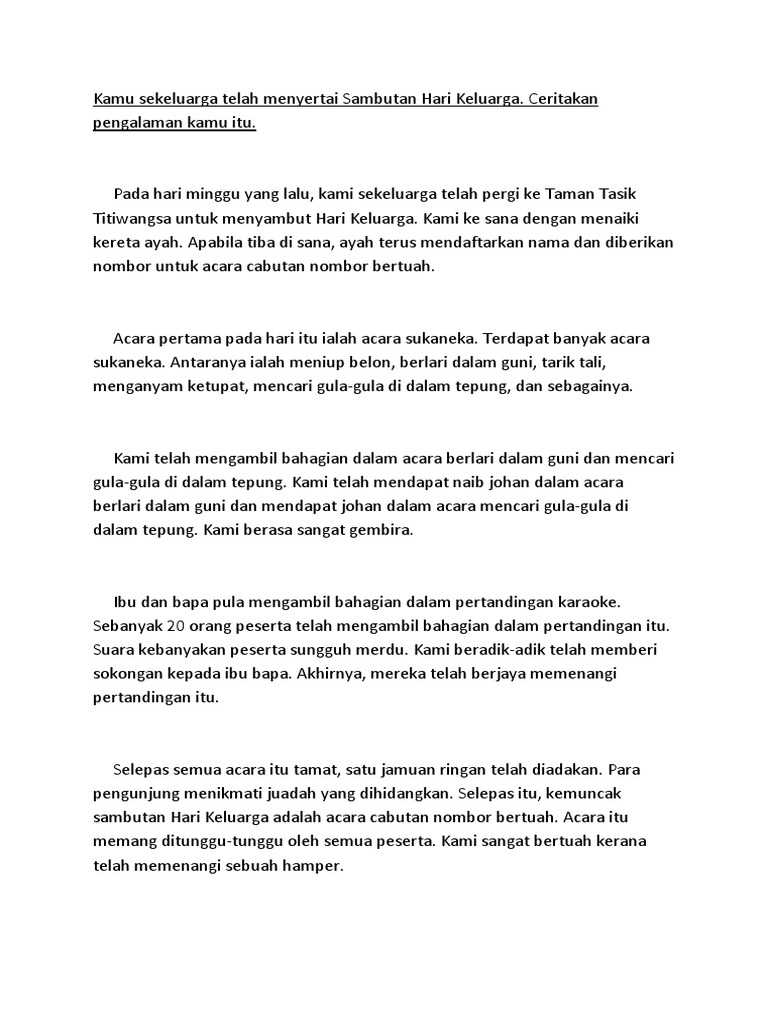 Aktiviti hari keluarga karangan. Catatan harian kamu telah menyertai satu lawatan sambil belajar ke sebuah negeri lain. Koleksi contoh karangan bahasa melayu bm upsr 4ujian pentaksiran sekolah rendah.